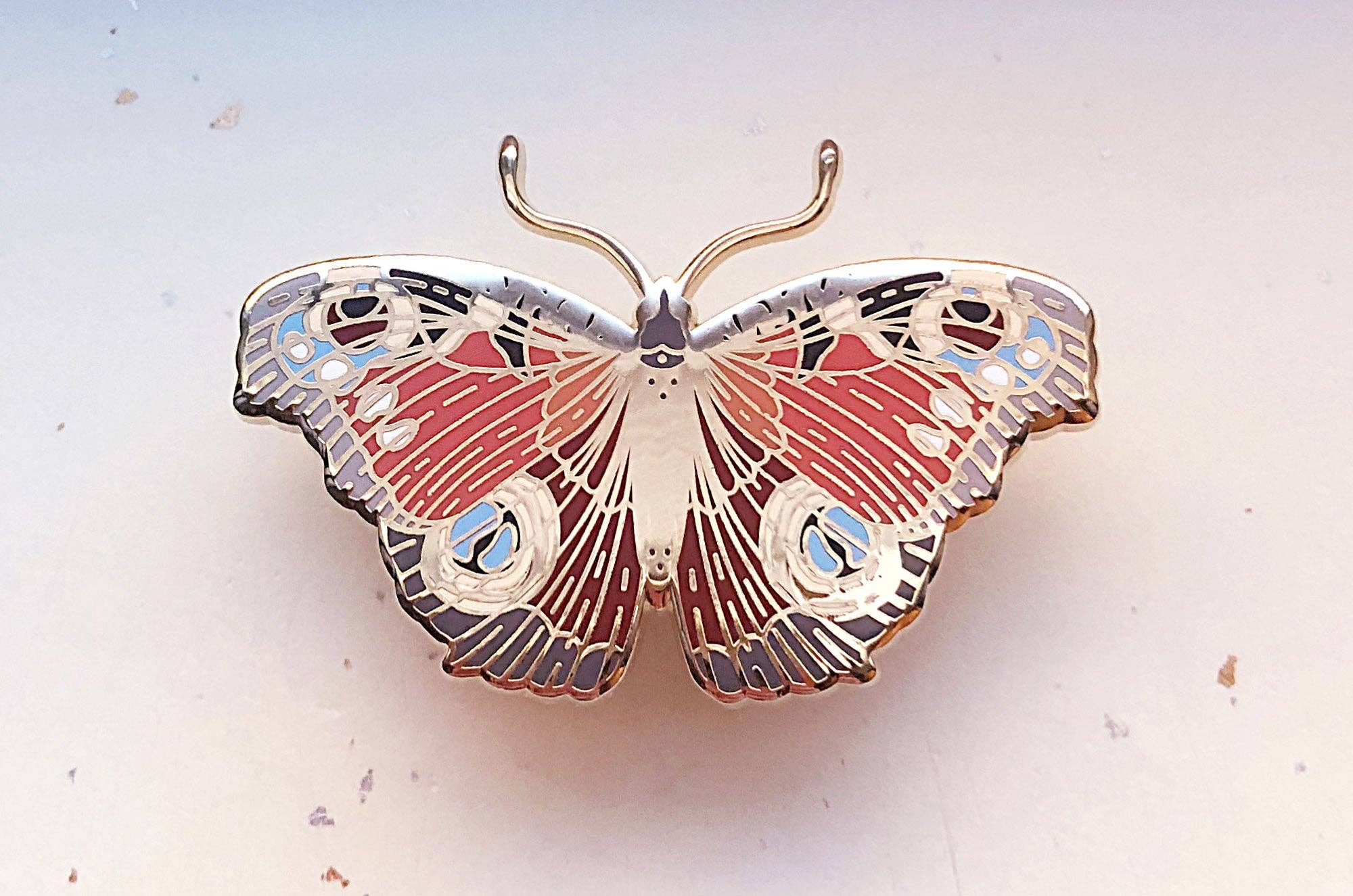 This stunning Peacock Butterfly enamel pin depicts the beautiful insect with its captivating markings and colors.