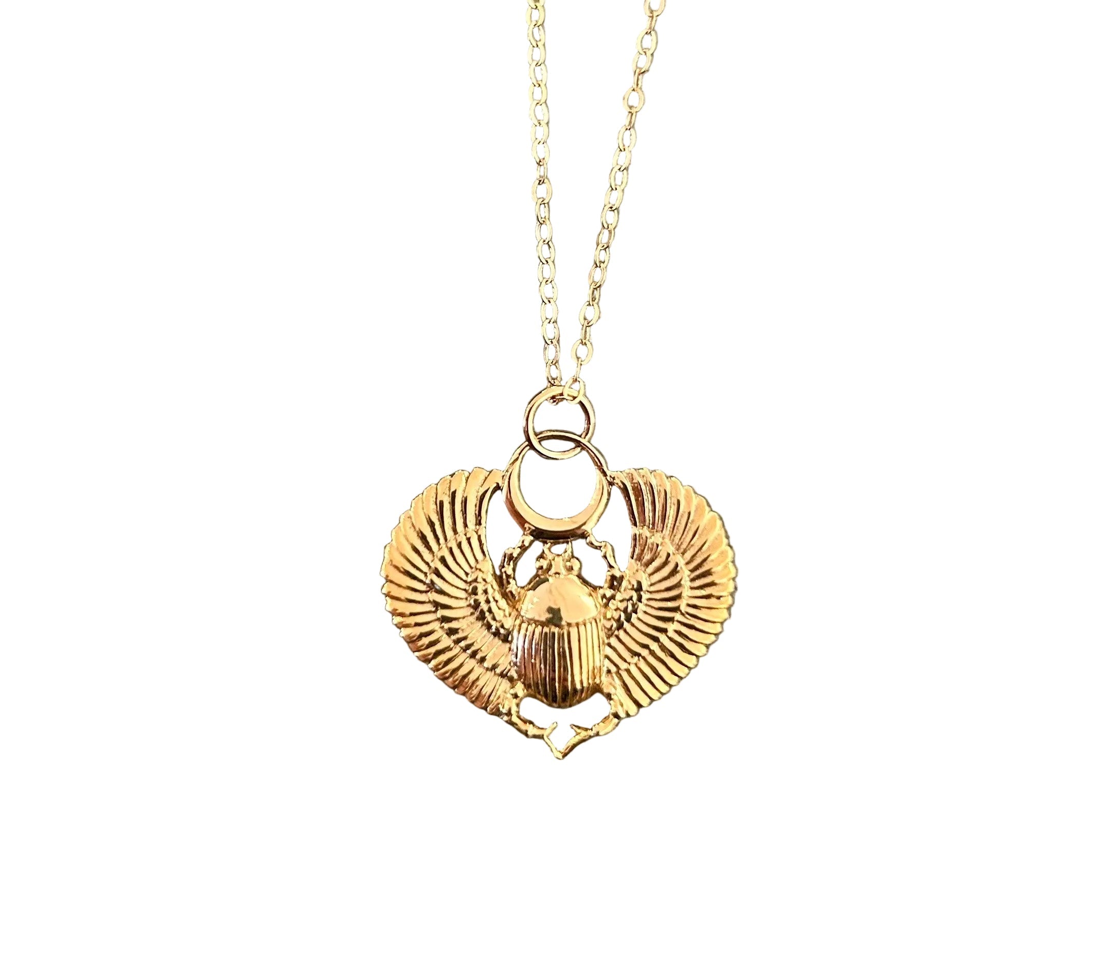 Egyptian Winged Scarab Pendant cast in bronze on a gold plated chain.