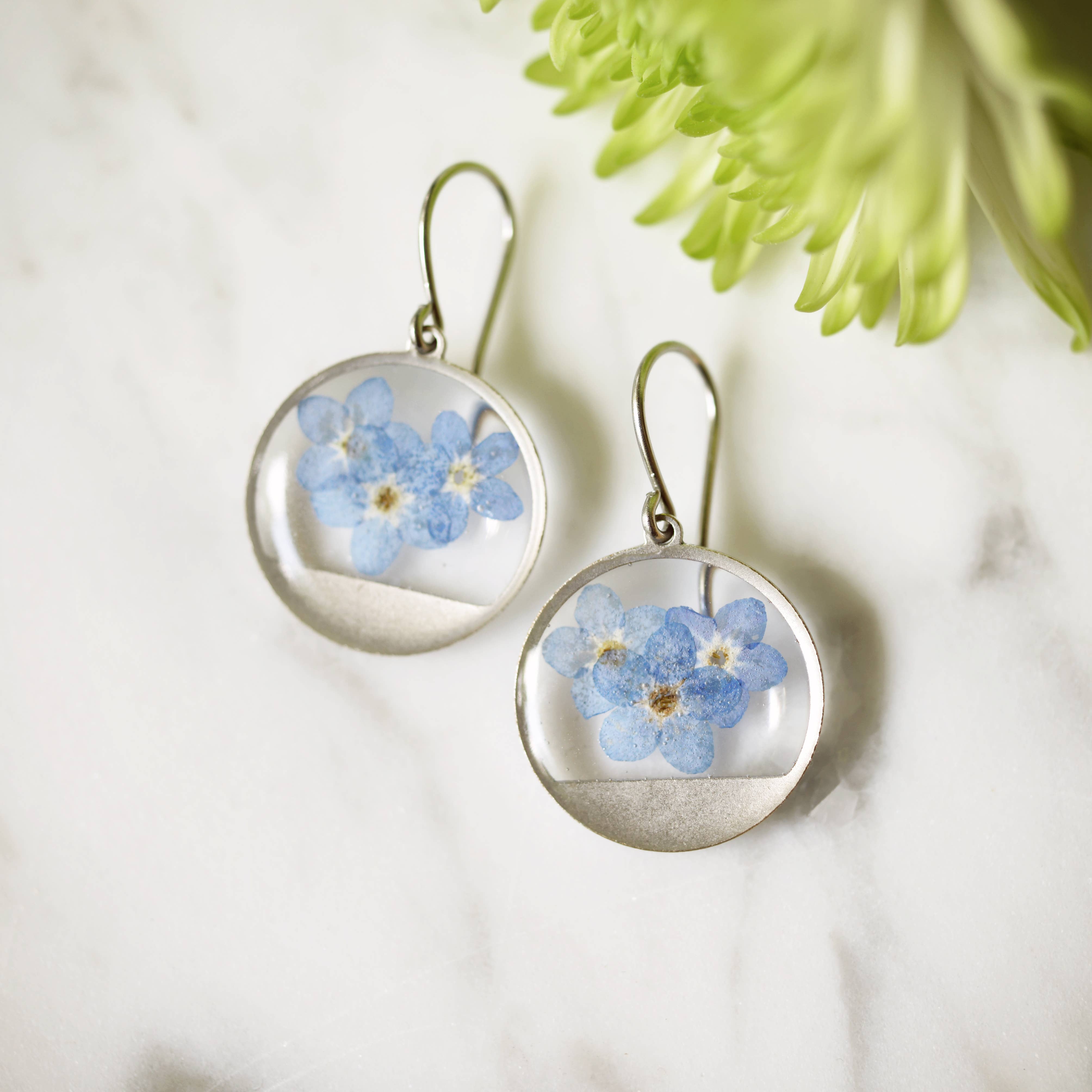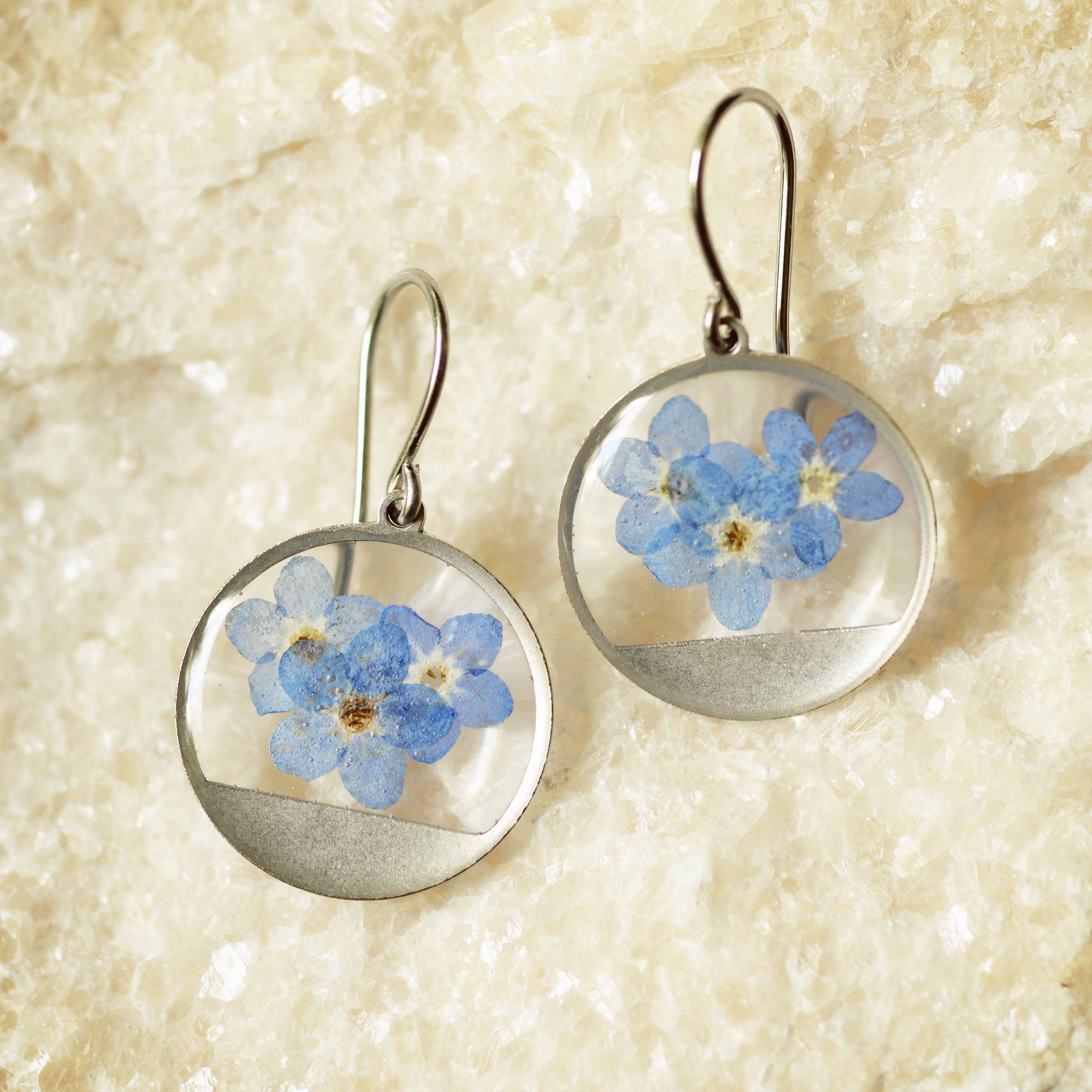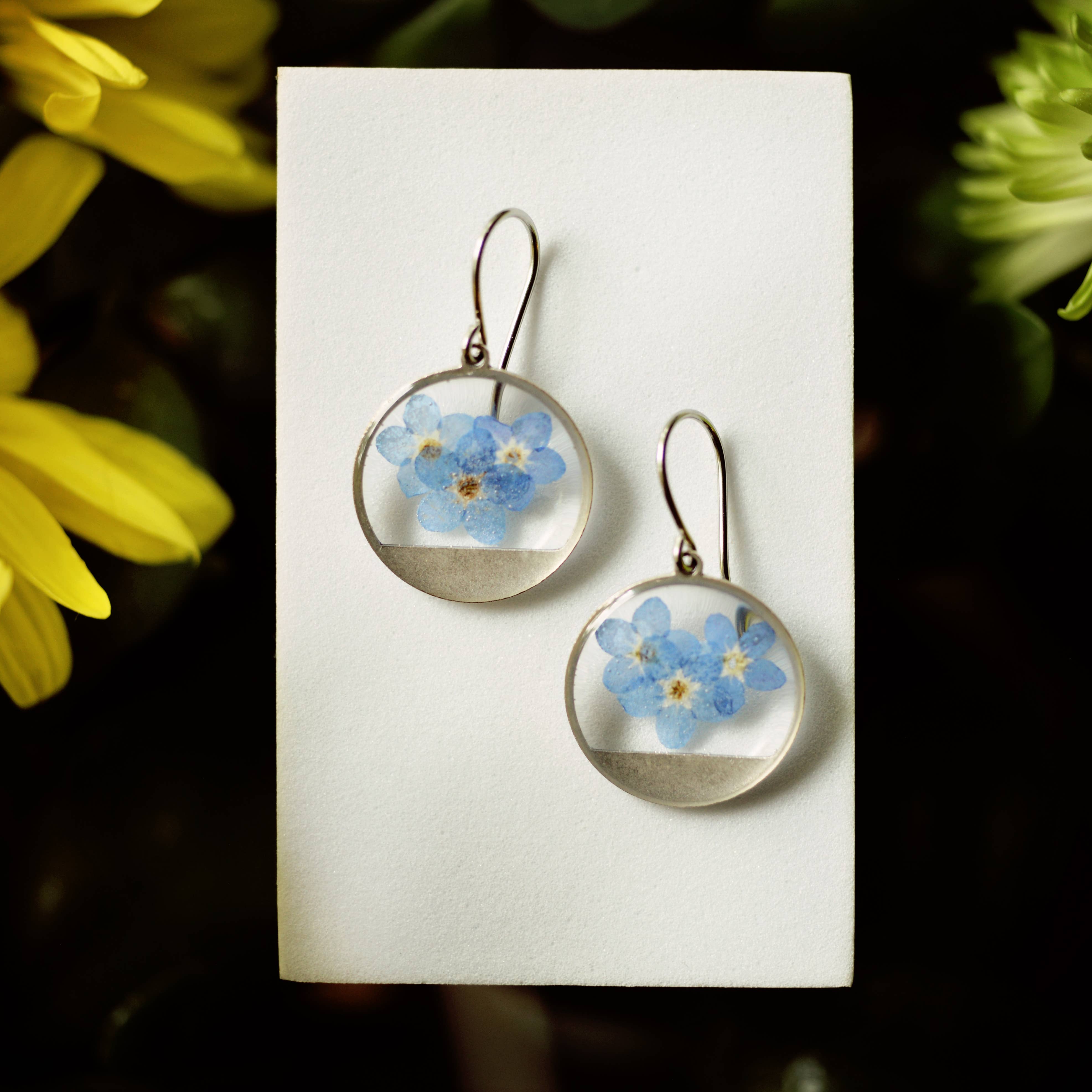 A sweet trio of forget me not flowers pressed and preserved in resin.