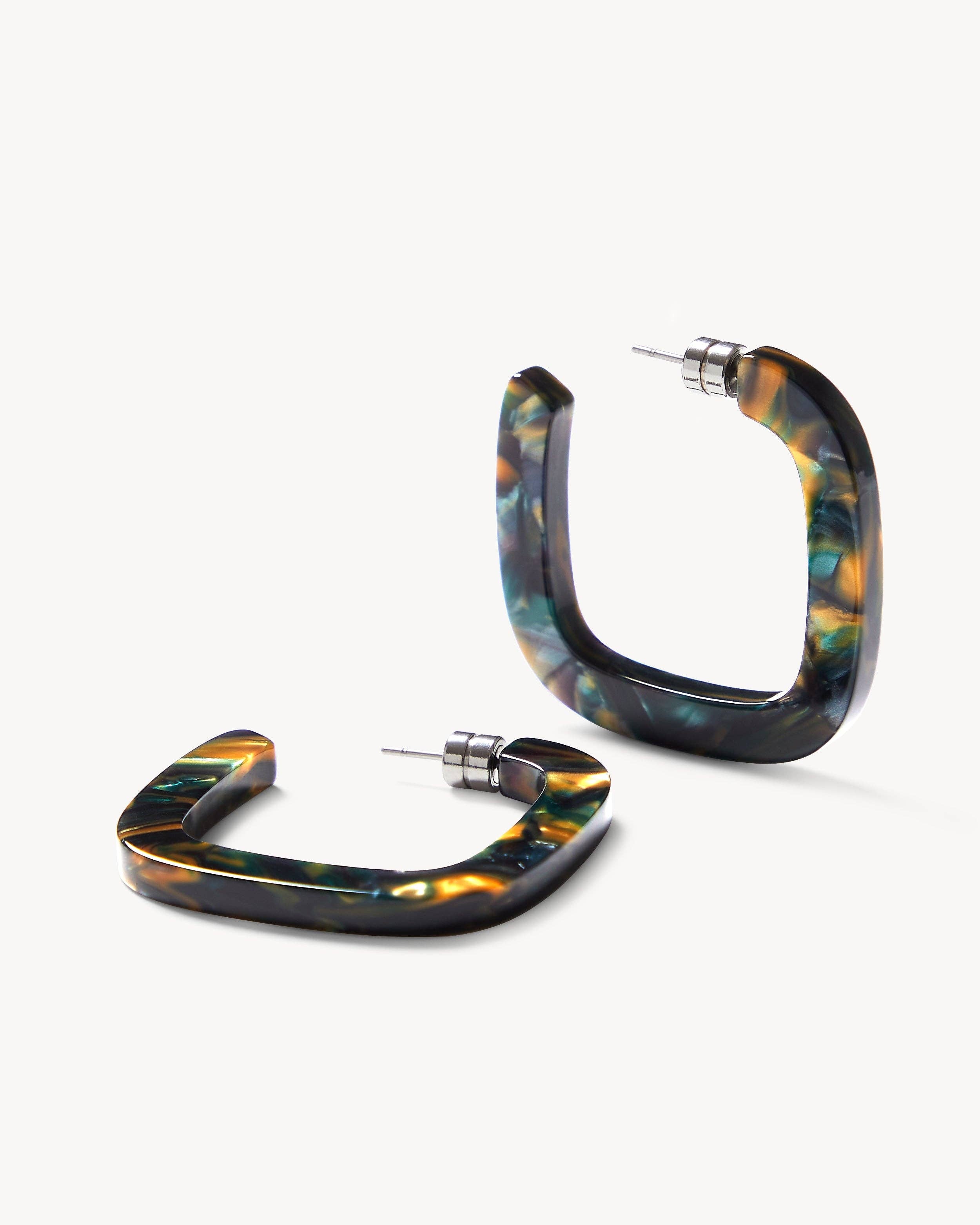 1.5” squared hoop earrings, handcrafted from our lightweight Italian acetate with engraved barrel backings.